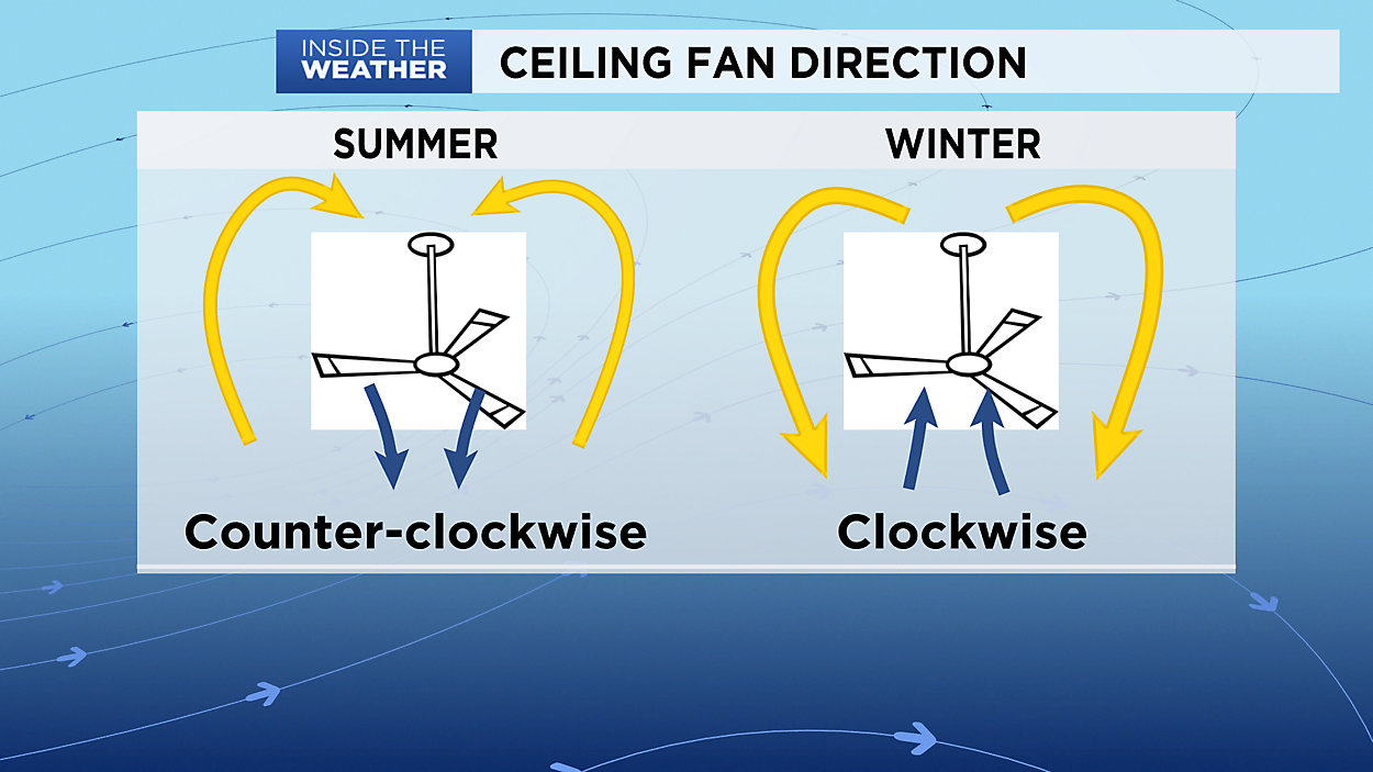 a. In the summer season, your fan blades should be set to rotate counterclockwise when looking up towards the ceiling. Air is pushed downwards, giving a cooling "wind chill" effect to your skin. The speed controlled by the pulldown chain should be set towards the max to help with the wind chill effect;